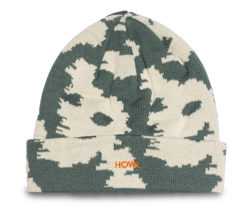 Acrylic flat knit with two color graphic jacquard, seamless construction and embroidery logo on cuff.