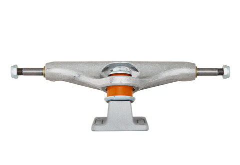 Industrial 2 Stage 11 IKP: Durable, all purpose, standard height truck with newly improved inverted kingpin features polished silver hanger with raw baseplate, orange cushions, and silver hardware.