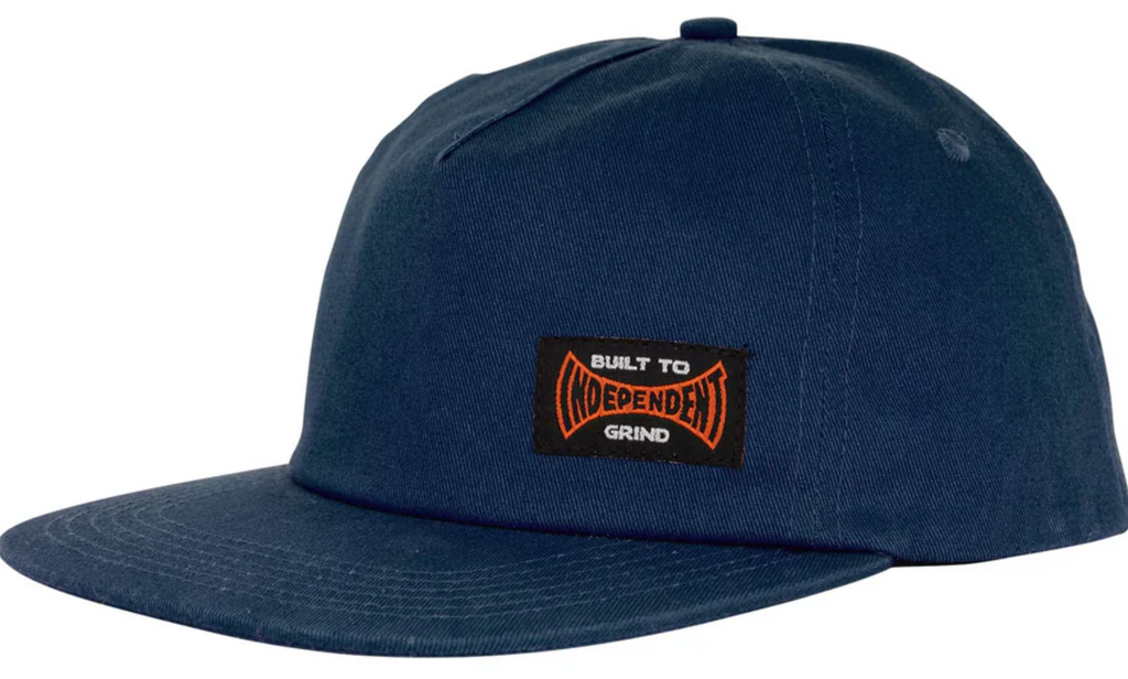 The Independent Built to Grind mid-profile fit, unstructured snapback 5 panel twill hat features reflective trims, woven label at front, mesh stay, sweatband label, loop label at rear adjuster and custom interior taping.