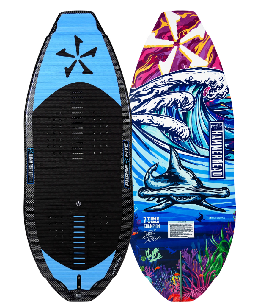 The Phase Five Hammerhead Wakesurfer is the king of revert. With a square nose and tail design, the Hammerhead delivers tons of speed and stability in both directions. Drew Danielo discovered that a traditional pulled in nose would struggle to ride backwards. This is where the Hammerhead triumphs. In addition, the peanut side rail design creates two contact points on the wave instead of one. This keeps the Hammerhead locked in and pointed down the line. The peanut outline adds surface area under each foot for increased maneuverability and speed than its predecessor. It features a full deck pad to take full advantage of riding revert and gives you the freedom to place your feet anywhere on the board! The Phase Five Hammerhead is built with Hybrid Carbon™ material and a single fin setup loaded with our 1” Skim Fin.
